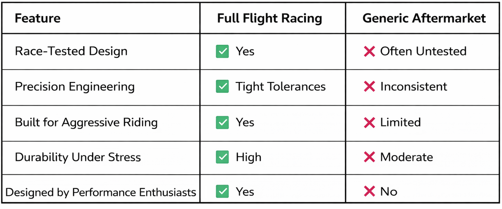 Unlike mass-produced parts, FullFlight Racing suspension components are designed with real-world riding and racing conditions in mind. Every detail is engineered for performance, strength, and reliability—so you can ride harder with confidence.